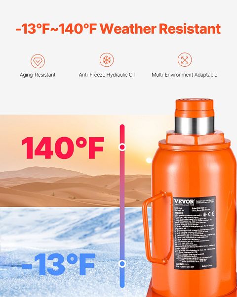 - Auslaufsicheres Design: Dieser hydraulische Wagenheber verfügt über präzise Industrieschweißnähte und abgedichtete Verbindungen, um Leckagen vorzubeugen. Er ist für den Einsatz bei jedem Wetter mit einem Temperaturbereich von -13 ℉ bis140 ℉ (-25 bis 60 °C) ausgelegt, was eine zuverlässige Leistung gewährleistet und das Risiko der Alterung von Teilen und des Einfrierens des Hydrauliköls verringert.