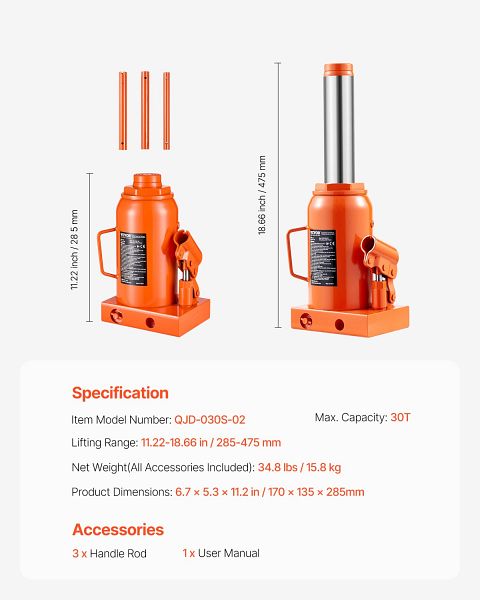 VEVOR Hydraulischer Wagenheber, 30t Manueller Stempelwagenheber 285-475mm, PSDSDS30TZJSLR6N6V0, 0197988654278