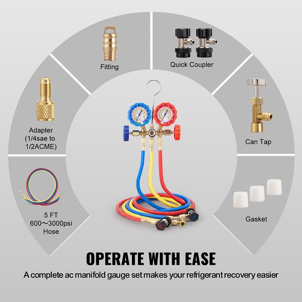 - Kompletter AC-Messsatz: 1 x Manometer mit 3 Ventilen, 2 x Schnellkupplungen, 1 x Adapter (1/4sae auf 1/2ACME), 1 x Dosenhahn, 3 x 5 Fuß Schlauch (600~3000 psi), 1 x Bedienungsanleitung, 1 x Haken, 3 x Dichtung, 1 x Fitting. Ein komplettes Set für die Kältemittelrückgewinnung und -befüllung! Genießen Sie die mühelose Installation und Bedienung, während Sie Ihre HVAC-Probleme im Keim ersticken.