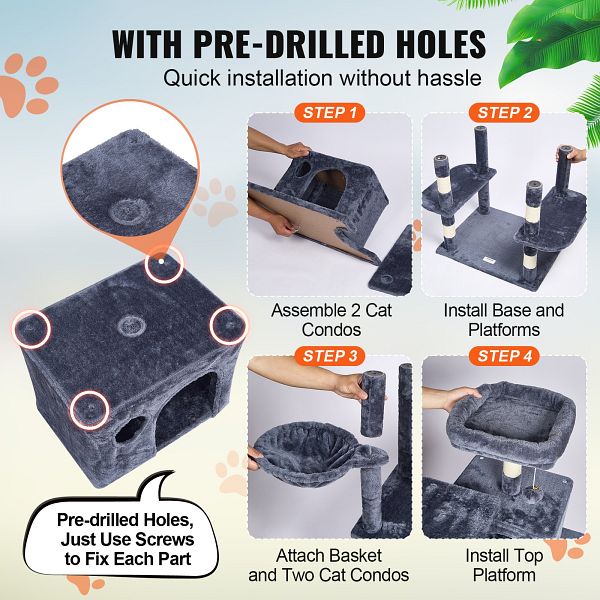 - Einfache Installation: Vorgebohrte Löcher machen die Installation mühelos. Unser Kratzbaum für Hauskatzen wird mit einer ausführlichen Montageanleitung und allen erforderlichen Schrauben, Bolzen, Schraubenschlüsseln und Dehnschraubensätzen geliefert. Selbst Erstbenutzer von Haustiermöbeln können den Aufbau problemlos durchführen und so Zeit und Mühe sparen.