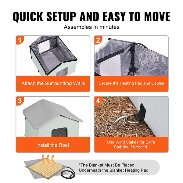 - Robust und stabil: Dieses Produkt verfügt über ein mehrfach verstärktes Design und ist mit 4 Windheringen ausgestattet, die dafür sorgen, dass es auf Gras oder schlammigem Boden fest an seinem Platz bleibt, ideal für ein beheiztes Katzenhaus im Freien. Eine verdickte PP-Platte in der Mitte bietet zusätzlichen Halt, um Stabilität und Haltbarkeit für den Langzeitgebrauch zu gewährleisten.