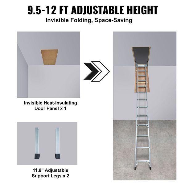 VEVOR Klappbare Dachbodenleiter aus Aluminium, verstellbar, tragbar, Dachbodentreppe, Decke, ZDKKSGLTLHJ3WVQM2V0, 0840349969367