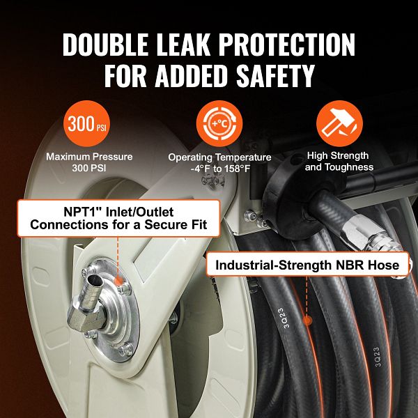 - Gehen Sie auf Nummer sicher, ohne zu tropfen: Der biegsame und dennoch robuste NBR-Schlauch mit 300 PSI Druck hält Temperaturen von kühlen -20°C bis zu angenehmen 70°C stand. In Kombination mit unserem NPT-19,05 mm-Anschluss ist es eine Verbindung wie im Tankhimmel. Genießen Sie ein nahtloses und kleckerfreies Erlebnis mit unserem Ölschlauchaufroller!