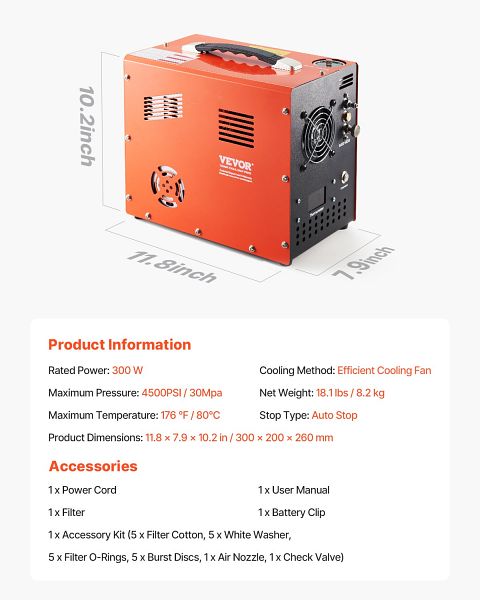 VEVOR PCP-Luftkompressor 4500PSI Auto-Stop-Luftgewehrkompressor, Eingebauter Konverter, QQGYCQJJS300PB0NLV2, 0197988651932
