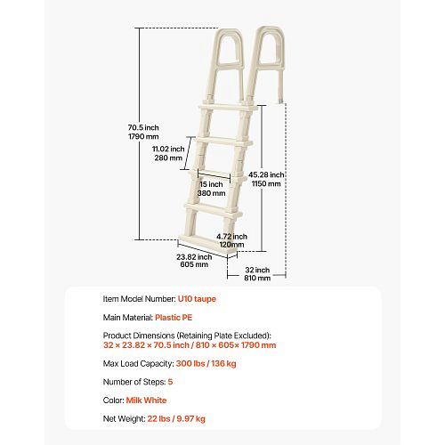 5-stufige Leiter mit doppeltem Handlauf: Diese Poolleiter verfügt über 5 Stufen und doppelte Handläufe auf beiden Seiten. Die Stufen sind mit strukturierten Mustern versehen, um ein sicheres Ein- und Aussteigen auch unter Wasser zu gewährleisten und Ausrutschern und Unfällen vorzubeugen
