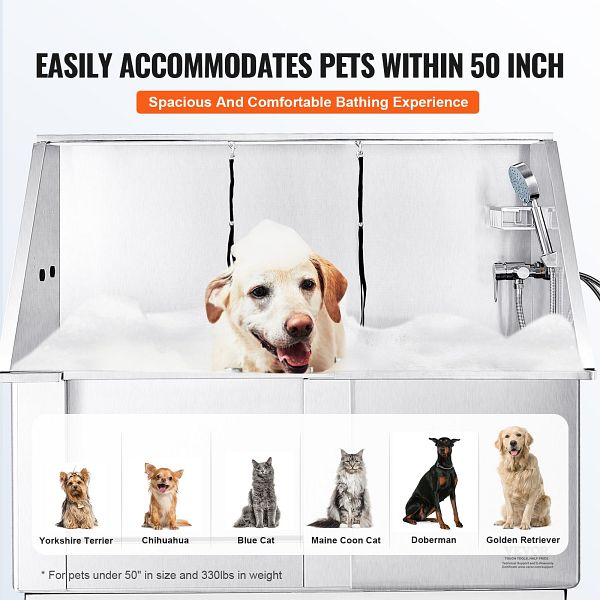 - 150 kg Tragfähigkeit: Geeignet für Haustiere bis zu einer Größe von 1270 mm und einem Gewicht von bis zu ca. 150 kg. Ob kleine Haustiere wie Yorkshire Terrier, Chihuahuas oder Maine Coon-Katzen oder mittelgroße bis große Haustiere wie Golden Retriever, Dobermänner oder Maine Coon-Katzen - sie alle können ein geräumiges und komfortables Badeerlebnis genießen.