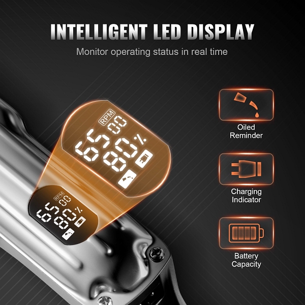 - Intelligente LED-Anzeige: Behalten Sie die Kontrolle über Ihr Haarschneideerlebnis mit der LED-Anzeige, die Sie über die Akkulaufzeit, die Ladeanzeige und die Ölerinnerung informiert. Die präzise Statusüberwachung hält Ihren professionellen Haarschneider sowohl für den Heim- als auch den professionellen Friseurgebrauch in optimalem Zustand.