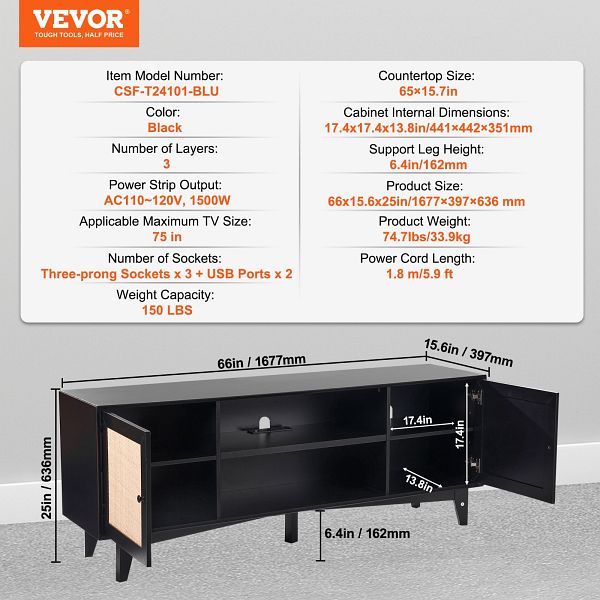 VEVOR Rattan-TV-Ständer 191cm Fernseher Boho-TV-Schrank Fernsehschrank Schwarz, TBDSJ66INCHEQ0NLRV2, 0197988387916