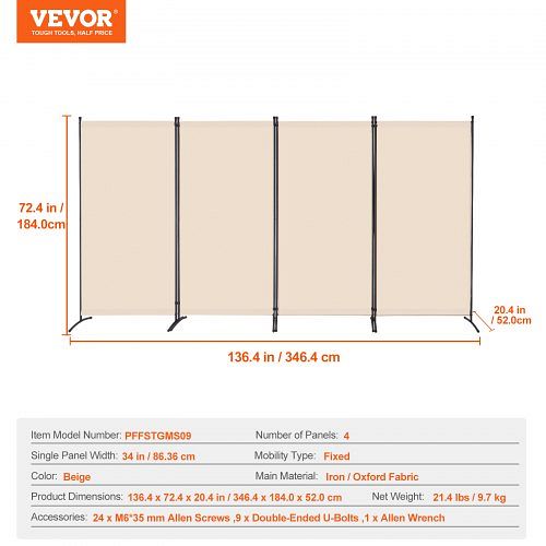 VEVOR Raumteiler 4 Paneele 3464x1840x520mm, faltbarer Sichtschutz & tragbare Trennwand, freistehend, Beige, BLFWFGQ4MB348QKQ9V0, 0197988089544