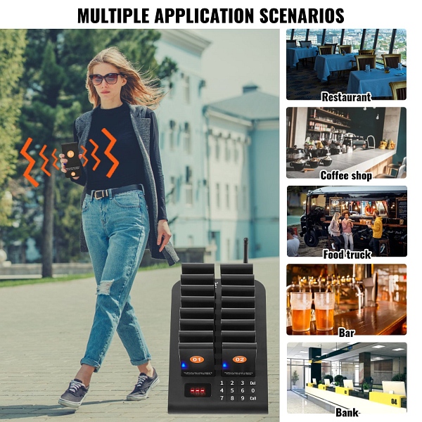 - Ausgezeichnete Leistung: Das Restaurant-Paging-System besteht aus einem 998-Kanal-Funksender mit Touchscreen und 16 Pagern. Die Gäste müssen sich nicht in einer Schlange anstellen, wodurch die soziale Distanz gewahrt und die Effizienz gesteigert wird.