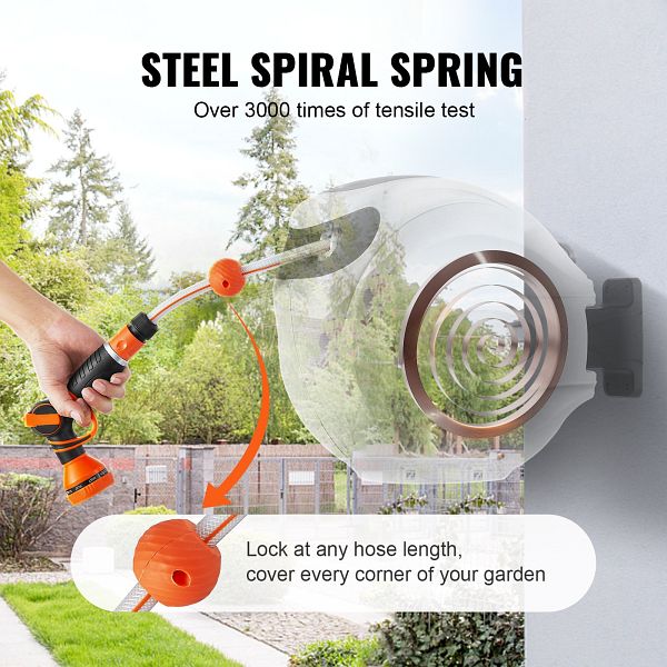- In Position verharren: Dank des Verschluss-Systems kann der Schlauch in jeder gewünschten Länge arretiert werden. Unser automatisch einziehbarer Schlauchaufroller ist mit einem 20 m x 12 mm Schlauch vorinstalliert, der jeden Winkel Ihres Gartens abdeckt. Er verfügt über eine eingebaute Stahlspiralfeder, die einen Zugtest mehr als 3000 Mal bestanden hat, sodass er auch bei langfristiger Dehnung glatt und alterungsbeständig ist.