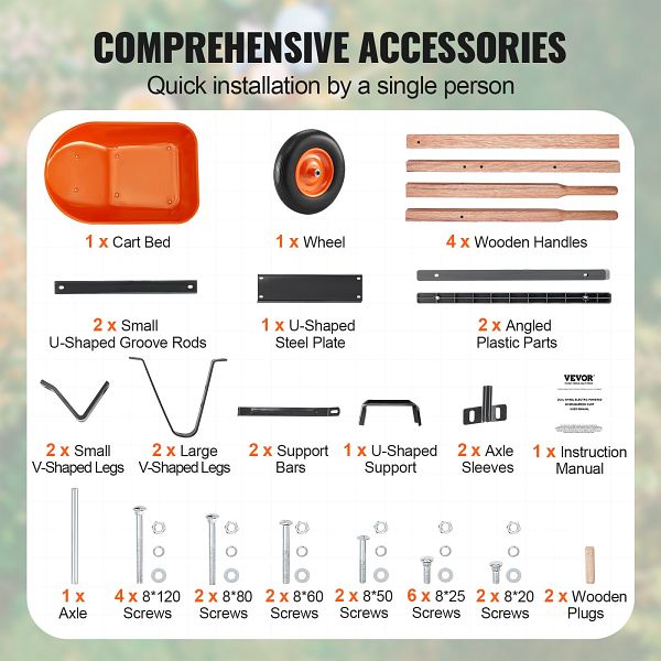 - Was Sie erhalten: Das Paket umfasst: 1 Tablett, 4 Holzgriffe, 2 abgewinkelte Kunststoffteile, 1 U-Kanal-Stahlplatte, 2 Stützstangen, 1 Achse, 2 kleine V-Beine, 2 große V-Beine, 2 Achshülsen, 1 U-Stütze (Holzgriffverbindung), 2 kleine U-Kanal-Stangen, 1 Rad, 2 Holzdübel, Schrauben (8120) x 2, Schrauben (870) x 4, Schrauben (845) x 2, Schrauben (822) x 6, Schrauben (820) x 2, Schrauben (880) x 2.