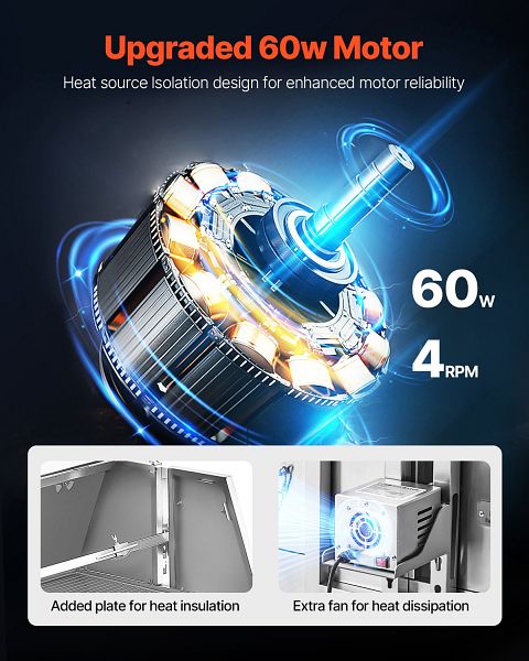- Verbesserter Hitzeschild: Das Grill-Rotisserie-Set verfügt über einen neu verbesserten Motor, der das Grillen einfacher macht! Es verfügt über einen leistungsstarken 60-W-Motor, der die Spindel mühelos mit 4 U/min drehen kann. Die vergrößerte Heizplatte und die erhöhte Leistung des Motorgebläses verhindern wirksam, dass Wärmequellen auf den Motor einwirken, wodurch Motorstörungen reduziert werden