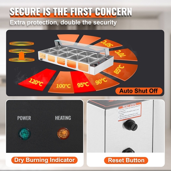 - Zusätzliche Sicherheit: Wir haben unseren Speisenwärmer mit einer neu entwickelten „Trockenbrennanzeige“ und einer „Reset-Taste“ ausgestattet. Die Trockenbrennanzeige stoppt automatisch die Erwärmung der Speisen, wenn die Temperatur 248 °F (120 °C) überschreitet. Um den Betrieb fortzusetzen, muss die Reset-Taste gedrückt werden.