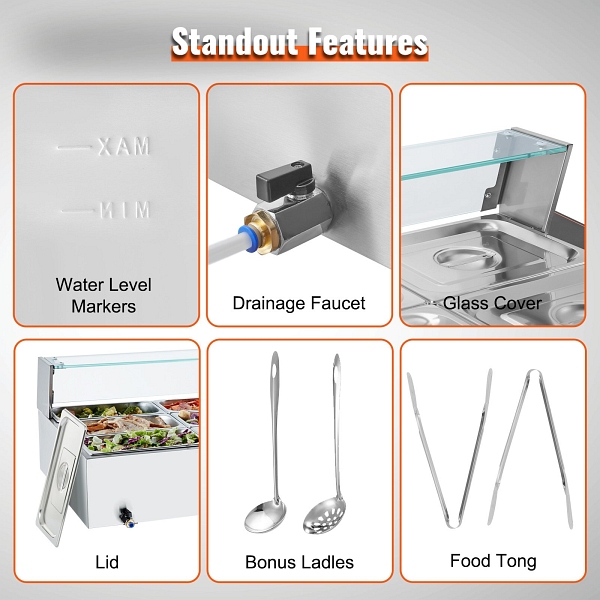 - Robuste Edelstahlkonstruktion: Dieser Speisenwärmer ist auf Langlebigkeit ausgelegt. Die robuste Edelstahlkonstruktion ist für den Dauereinsatz ausgelegt und leicht zu reinigen und zu pflegen. Der Behälter hat eine verdickte Wand (0,03 Zoll / 0,8 mm dick), die für zusätzliche Stabilität sorgt und das Wasser sicher abdichtet.
