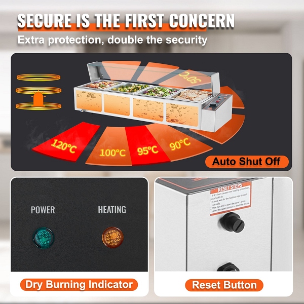 - Zusätzliche Sicherheit: Wir haben unseren Speisenwärmer mit einer neu entwickelten „Trockenbrennanzeige“ und einer „Reset-Taste“ ausgestattet. Die Trockenbrennanzeige stoppt automatisch die Erwärmung der Speisen, wenn die Temperatur 248 °F (120 °C) überschreitet. Um den Betrieb fortzusetzen, muss die Reset-Taste gedrückt werden.