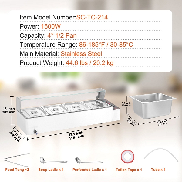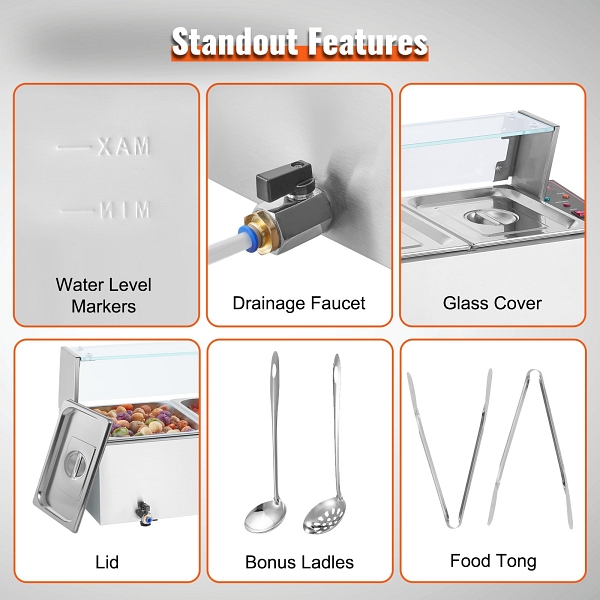 - Robuste Edelstahlkonstruktion: Dieser Speisenwärmer ist auf Langlebigkeit ausgelegt. Die robuste Edelstahlkonstruktion ist für den Dauereinsatz ausgelegt und leicht zu reinigen und zu pflegen. Der Behälter hat eine verdickte Wand (0,03 Zoll / 0,8 mm dick), die für zusätzliche Stabilität sorgt und das Wasser sicher abdichtet.