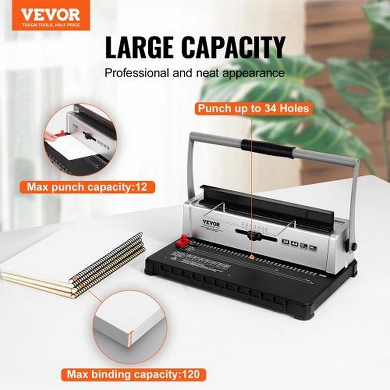 VEVOR Spiralbindegerät, Manuell 34-Loch, 120 Blatt, 3/16-9/16 Zoll Spiralbindung, für A4, A5, Briefformat, ZDJ20XQSSD34J0H4EV0, 0197988194798