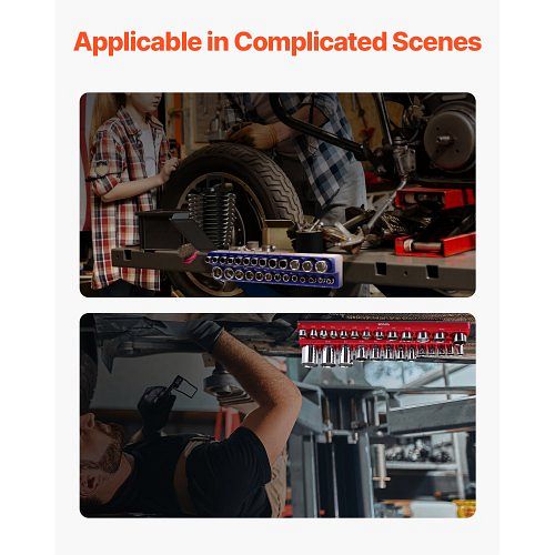 Breite Anwendung: Ideal für den Einsatz in 4S-Shops, Fabriken, Autowerkstätten, bei der Gerätereparatur oder in Heimwerkstätten. Das VEVOR-Set mit metrischen und SAE-Steckschlüsselhaltern bietet praktische Aufbewahrungslösungen für verschiedene Szenarien.