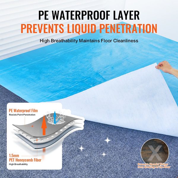 - Wasserdicht und atmungsaktiv: Dieser Bodenschutz verfügt über eine wasserdichte PE-Schicht, die das Eindringen von Flüssigkeiten verhindert und Böden sauber hält. Seine hohe Atmungsaktivität verhindert das Wachstum schädlicher Bakterien und bietet umfassenden Schutz für Ihr Zuhause.