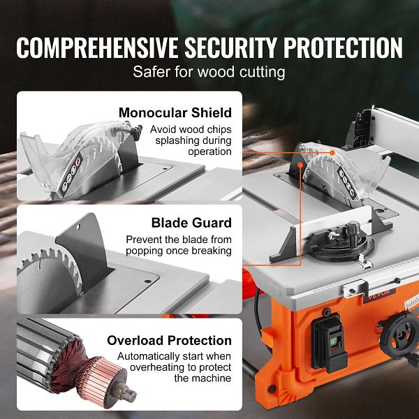 - Ihre Sicherheit steht an erster Stelle: Sicherheit hat für uns immer oberste Priorität. Diese Tischkreissäge ist mit einem Schutzschild ausgestattet, um zu verhindern, dass Sägespäne in der Luft verbleiben. Ein Blattschutz verhindert auch, dass das Blatt nach einem Bruch herausspringt. Wenn die Maschine überhitzt, schaltet der Kupferdraht automatisch einen Überlastungsschutz ein, um die Maschine vor Schäden zu bewahren. Mit solchen Sicherheitsvorrichtungen kann man nichts falsch machen!
