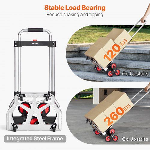 Robust gebaut, hält Tonnen: Dieser robuste Treppenwagen mit integriertem Rahmen aus Karbonstahl ist stabil und robust und kann auch schwere Lasten transportieren. Egal, ob Sie 260 lbs / 118 kg auf ebenem Boden oder 120 lbs / 54 kg die Treppe hinauf transportieren, er bewegt sich nicht. Perfekt für die meisten Anforderungen im Haushalt und im Geschäft.