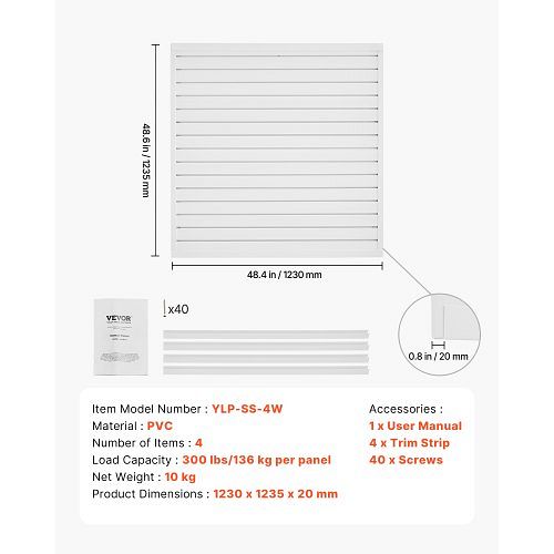 VEVOR Werkzeugwand 1230x1235x20mm, PVC-Lamellenwand, weiß, 136kg/Platte, Kupplungsstruktur & DIY-Zuschnitt, BTQBPVC16SQF6KZ18V0