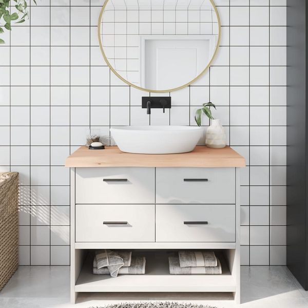 Hast du vor, dein Badezimmer zu renovieren? Dann ist diese Waschtischplatte aus Holz eine perfekte Wahl für dich! Stabile Konstruktion: Diese Waschtischplatte besteht aus massivem Eichenholz, einem wunderschönen Naturmaterial. Eichenholz weist eine mittelbraune Farbe und eine dichte Maserung auf, was zu seiner einzigartigen Optik beiträgt. Vielseitig einsetzbar: Dieses Holzplatte lässt sich nicht nur als Waschtischplatte verwenden, sondern auch mit verschiedenen Gestellen kombinieren, um als Regal, Schrankoberplatte, Schreibtischplatte, Tischplatte usw. zu dienen. Unbehandelte Oberfläche: Da die Waschtischplatte aus massivem, unbehandeltem Eichenholz gefertigt ist, kannst du ihre natürliche Farbe beibehalten, sie aber auch nach Belieben anstreichen oder lackieren. Handgefertigt mit Naturkante: Diese Waschtischplatte ist handgefertigt und besitzt eine Naturkante. Dabei sind Aststellen, Risse, leicht geschwungene Formen und verschiedene Farbtöne Teil des Eichenholzes und machen jeden Waschtisch zu einem Unikat. Die Lieferung erfolgt nach dem Zufallsprinzip. Gut zu wissen: Als Naturprodukt kann Holz Aststellen und Unebenheiten aufweisen, die wir mit schwarzer Füllung ausfüllen, um ein glattes Aussehen zu gewährleisten.