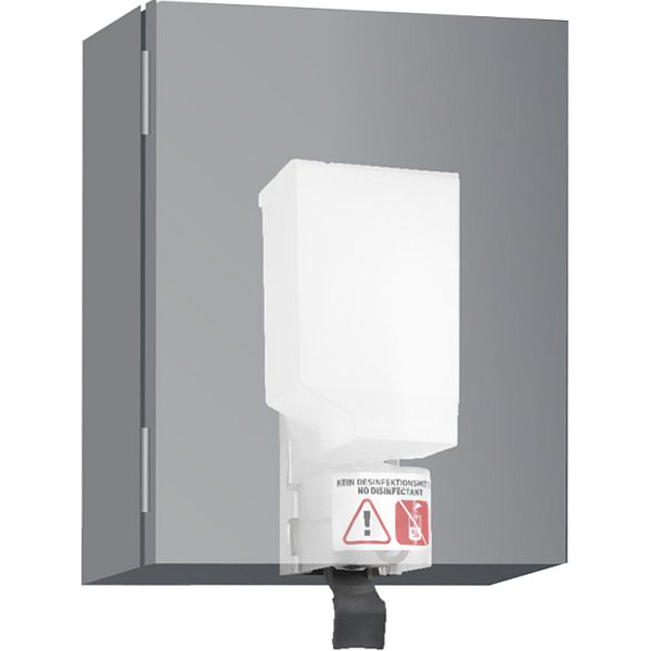 Flüssigseifenspender aus robustem, keimreduzierendem und pflegeleichtem Edelstahl (Chromnickelstahl WN 1.4404) für Schrank-Montage. Zum Einbau in bauseitigen Schrank. Einhandbedienbare und tropffreie Seifenpumpe. Vorgesehen für handelsübliche 500-ml oder 950-ml-Einweg-Flaschen Flüssigseife oder Handlotion. Nachfüllbar von oben. Mit optionalem Aufstecktank auch nachfüllbar aus Großgebinde, Verschleißteile modular austauschbar. Montage: Mit zwei Schrauben durch Schlüssellöcher und ein optionales Anti-Diebstahl-Loch in der Rückwand. Lieferung einschließlich Befestigungsmaterial, selbstklebendem Hinweissymbol „Seife“ und Erstbefüllung mit Seife. Abmessungen: 67(69) x 259(221) x 97(88) mm.