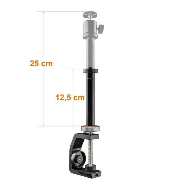 - Auszugshöhe der Mittelsäule 12,5 bis 20 cm, Klemmbreite max. 6 cm