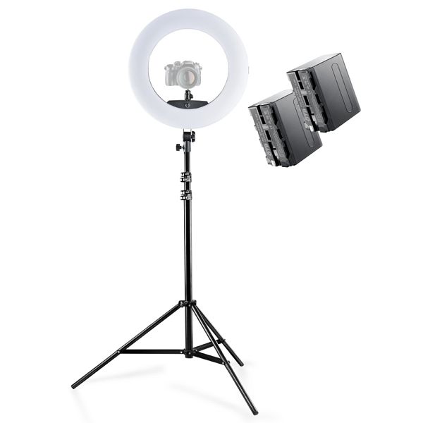 - Set aus LED Ringleuchte für Foto und Video plus 2 NP-F-Akkus plus stabilem Lampenstativ