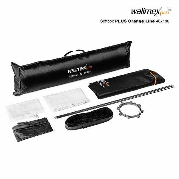 - 1x Walimex pro Softbox PLUS Orange Line 40x180, inkl. Softbox, Gestänge, Zwischendiffusor, Außendiffusor, Stripmaske, Grid und Transporttasche