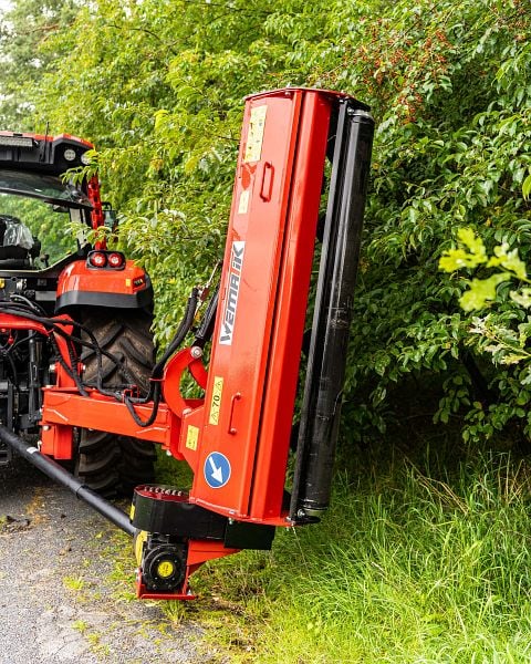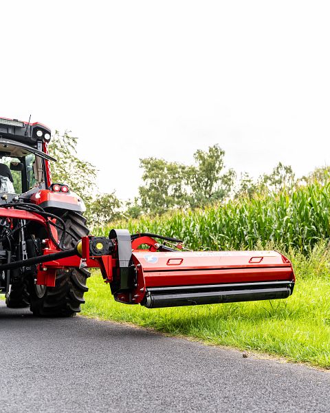 Durch zwei Hydraulikzylinder kann der Hochgrasmäher perfekt an Böschungen und zur Räumung von Gräben benutzt werden. Dieser Schlegelmulcher kann sowohl seitlich neben dem Traktor als auch hinter dem Traktor gezogen werden.