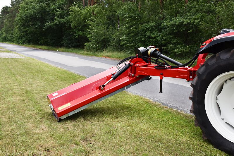 Durch zwei Hydraulikzylinder kann der Hochgrasmäher perfekt an Böschungen und zur Räumung von Gräben benutzt werden. Dieser Schlegelmulcher kann sowohl seitlich neben dem Traktor als auch hinter dem Traktor gezogen werden.