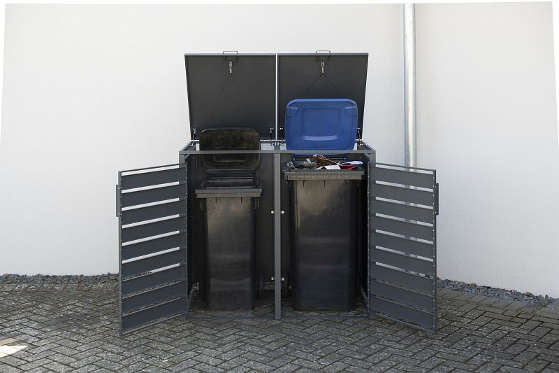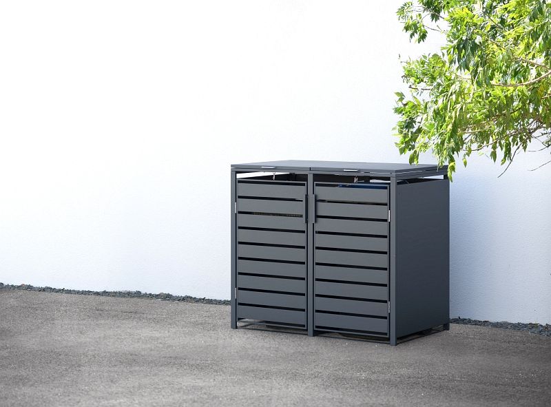 Kaum ein Gegenstand des täglichen Gebrauchs ist so essenziell, gleichzeitig aber optisch so unbeliebt wie die Mülltonne. Mit der 2er Mülltonnenbox Kubus von Westmann knüpfen wir genau an dieses Problem an! Die moderne Mülltonnenverkleidung versteckt 2 unliebsame Mülltonnen gekonnt hinter einem Korpus aus dunkelgrauem Stahl. Neben der sichtbaren Aufwertung der Mülltonne schützt die Mülltonnenbox deine Mülltonne auch vor zu starker Sonneneinstrahlung, und beugt somit intensiver Geruchsentwicklung vor. Um deine Mülltonnen zu befüllen, lassen sich die einzelnen Mülltonnenboxen einfach per Deckel öffnen. Die am Deckel angebrachten Gasdruckfedern verhindern das unkontrollierte Zufallen des Deckels - das Befüllen der Mülltonnen ist somit problemlos und ohne Verletzungsrisiko möglich. Dank der zwei leichtgängigen Flügeltüren lässt sich die Tonne mühelos in die Mülltonnenbox hineinschieben. Alternativ kannst du die Mülltonnenverkleidung auch als Gartenschrank oder Gartenbox verwenden, und somit fix für Ordnung auf deinem Grundstück sorgen.